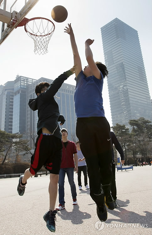 △ '봄,봄,봄' (서울=연합뉴스) 윤동진 기자 = 만물이 겨울잠에서 깨어난다는 '경칩'인 6일 오후 서울 영등포구 여의도공원에서 시민들이 농구를 하고 있다. 2015.3.6 mon@yna.co.kr