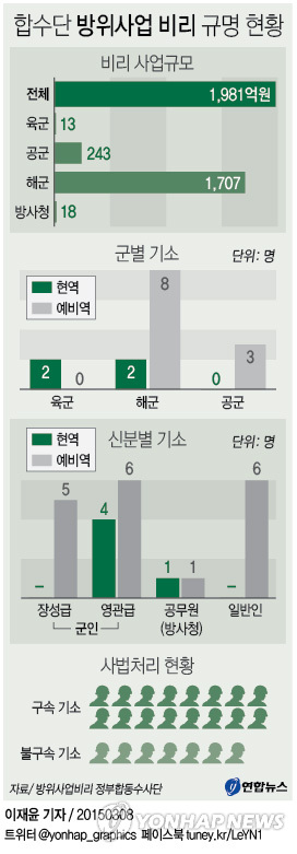 | △ <그래픽> 합수단 방위사업 비리 규명 현황 (서울=연합뉴스) 이재윤 기자 = 8일 합수단에 따르면 출범 후 재판에 넘겨진 인원은 23명으로 군함 건조, 전투기 정비, 방산물자 납품 등 방위사업 전 분야에 걸쳐 부정부패가 속속 드러났다. 합수단이 출범후 비리가 적발된 사업의 규모는 총 1천981억원으로 기소된 23명 중 군인은 예비역과 현역을 포함해 모두 15명이었다. yoon2@yna.co.kr 페이스북 tuney.kr/LeYN1 트위터 @yonhap_graphics |