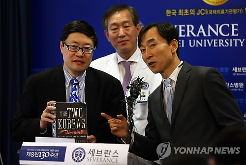 | △ "리퍼트, 한반도 분단 다룬 책 읽고 있어" (서울=연합뉴스) 신준희 기자 = 8일 오전 서울 서대문구 신촌세브란스병원에서 우창제 미국대사관 공보참사관(왼쪽)이 리퍼트 주한미국대사가 한반도 분단을 다룬 'The two Koreas'라는 책을 읽고 있다며 소개하고 있다. |