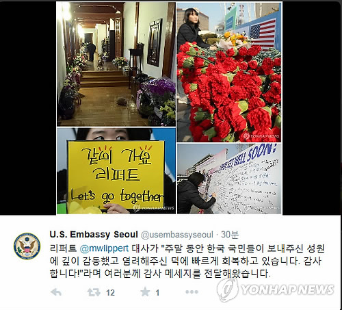주한미국대사관은 이날 오후 대사관 트위터 계정을 통해 "리퍼트 대사가 '주말 동안 한국 국민들이 보내주신 성원에 깊이 감동했고 염려해주신 덕에 빠르게 회복하고 있습니다. 감사합니다!'라며 여러분께 감사 메시지를 전달해왔다"고 전했다.