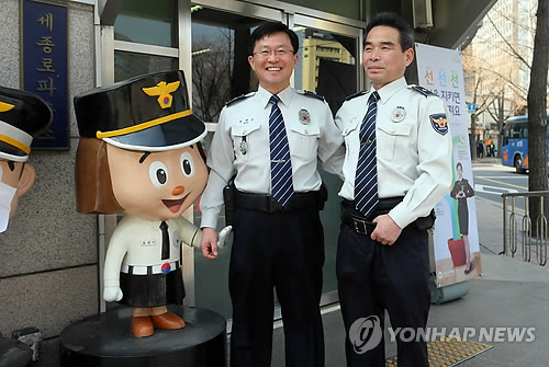 | △ (서울=연합뉴스) 최재구 기자 = 마크 리퍼트 주한 미국 대사 피습이 있었던 지난 5일 리퍼트 대사를 빠르게 병원으로 옮긴 서울 종로경찰서 세종로파출소의 류재훈(왼쪽) 경위와 김경호 경위. 2015.3.9 jjaeck9@yna.co.kr |