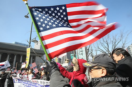 | △ 성조기 흔들며 쾌유기원 (서울=연합뉴스) 김주성 기자 = 구국채널 등 보수성향 단체 회원들이 9일 오후 서울 광화문 주한미국대사관 인근에서 마크 리퍼트 대사의 쾌유를 기원하며 성조기를 흔들고 있다. 2015.3.9 utzza@yna.co.kr |