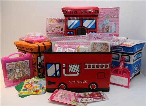 아이들이 좋아하는 버스 캐릭터로 포장한 스쿨박스에는 미술 앞치마, 악기세트 등 학용품 23종과 입학 축하 편지가 들어 있다.