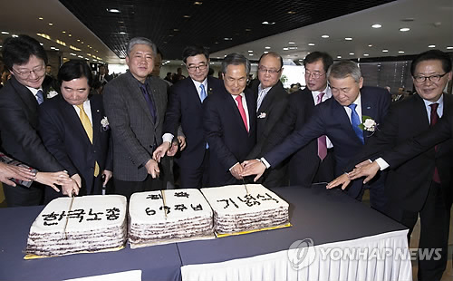 △ 한국 노총 69주년 기념 떡 커팅 행사 (서울=연합뉴스) 윤동진 기자 = 10일 오후 서울 영등포구 여의도동 한국노총에서 열린 '한국노총 창립 69주년 기념식 및 후원의 날 행사'에서 김동만 한국노동조합총연맹 위원장(왼쪽 세번째), 유승민 새누리당 원내대표(왼쪽), 우윤근 새정치민주연합 원내대표(왼쪽 다섯 번째) 등 참석자들이 떡 커팅 행사를 하고 있다. 2015.3.10 mon@yna.co.kr