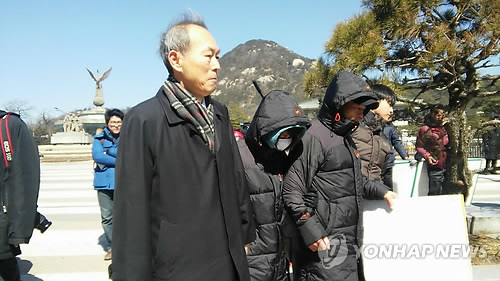 | △ 이석태 세월호 특별조사위원장, 실종자 가족 위로 (서울=연합뉴스) 설승은 기자 = '4·16 세월호 참사 특별조사위원회' 이석태 위원장은 10일 오후 서울 광화문광장 세월호 농성장에서 세월호 실종자 가족들을 만나 위로의 말을 전했다. 이 위원장은 앞서 청와대 앞 분수대에서 열리는 실종자들의 1인 시위 현장을 찾기도 했다. 청와대 앞 이 위원장 모습. |