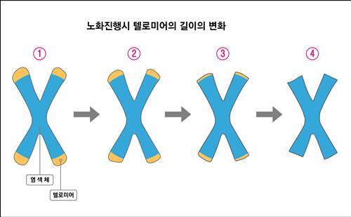 텔로미어는 세포 분열이 지속적으로 일어나는 염색체의 양끝 부분으로, 과학자들은 흔히 일종의 '생체 타이머'에 비유한다. 세포가 분열을 거듭하면서 마디가 잘려 나가고 마지막 마디마저 잘리면 이 세포는 죽는 것으로 볼 수 있기 때문이다. 세포가 죽는다는 것은 생체가 노화함을 의미하는 셈이다.