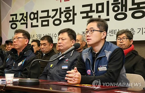 △ '공적연금으로 국민노후 보장' 국민행동 발족 (서울=연합뉴스) 서명곤 기자 = 11일 오전 서울 중구 태평로 한국프레스센터에서 열린 '공적연금강화 국민행동' 발족 기자회견에서 이충재 전국공무원노동조합 위원장이 발언을 하고 있다.
