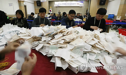 △ 전국동시조합장 선거 개표 (춘천=연합뉴스) 이상학 기자 = 제1회 전국동시조합장 선거일인 11일 오후 강원도 춘천시 석사동 도여성가족연구원에서 선관위 직원들이 개표 작업을 진행하고 있다.