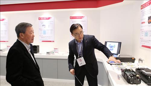 | △ 11일 서울 양재동 소재 LG전자 서초 R&D캠퍼스에서 개최한 '연구개발성과보고회'에서 구본무 LG 회장(왼쪽)이 LG화학 김명환 부사장(오른쪽)으로부터 LG연구개발상을 수상한 장거리 주행 전기차용 '고밀도 배터리'에 대한 설명을 듣고 있는 모습 |