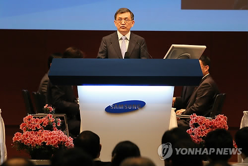 | △ 인사말 하는 권오현 의장 (서울=연합뉴스) 박지호 기자 = 13일 오전 서울 삼성전자 서초사옥에서 열린 '삼성전자 정기 주주총회'에서 권오현 의장(삼성전자 부회장)이 인사말을 하고 있다. |