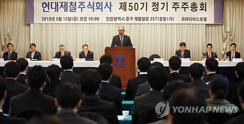 | △ 현대제철 제50기 정기 주주총회 (인천=연합뉴스) 윤태현 기자 = 13일 오전 인천시 중구 파라다이스호텔에서 열린 현대제철주식회 제50기 정기 주주총회에서 우유철 이사가 인사말을 하고 있다. |