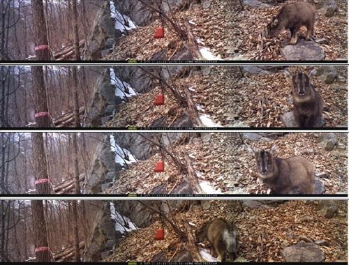 행동풍부화 회원들은 야생동물 생태 관찰을 위해 무인센서 카메라 4대를 설치, 2대에서 산양이 미네랄 블록(겨울철 동물에 부족한 비타민과 광물질을 제공하기 위해 놔두는 먹이)과 먹이를 먹는 모습을 사진과 동영상으로 촬영할 수 있었다.