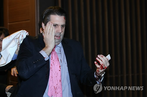 | △ 마크 리퍼트 주한 미대사가 5일 오전 서울 세종문화회관에서 열린 민화협 주최 초청 강연에 참석했다가 공격을 받고 피를 흘리며 행사장을 빠져나가고 있다. |