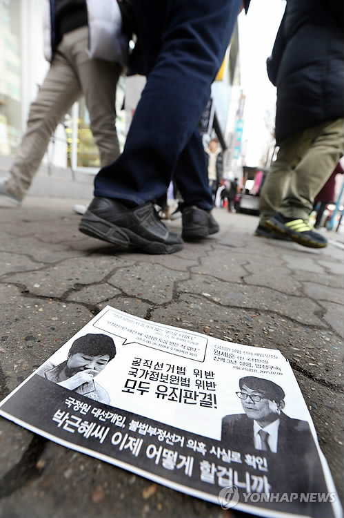 | △ 신촌 일대에 살포된 박 대통령 규탄 전단지 (서울=연합뉴스) 김수진 기자 = 박근혜 대통령 취임 2주년을 맞은 25일 오후 서울 마포구 신촌역 일대에 '민주주의를 염원하는 시민들' 명의로 살포된 박 대통령을 규탄하는 내용의 전단지가 바닥에 떨어져 있다. 2015.2.25 ksujin@yna.co.kr |