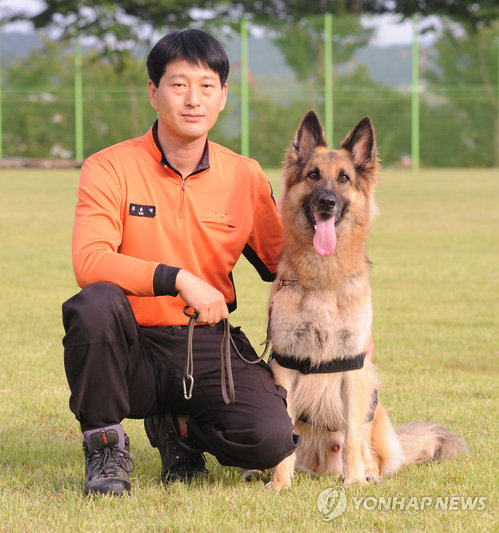△ (서울=연합뉴스) 영웅이 된 낙제생 구조견 `세중'(부산 소방안전본부 특수구조단 인명구조견. 8세. 독일 셰퍼드 수컷)과 핸들러 김용덕(42) 소방위. << 부산 소방안전본부 제공 >> photo@yna.co.kr