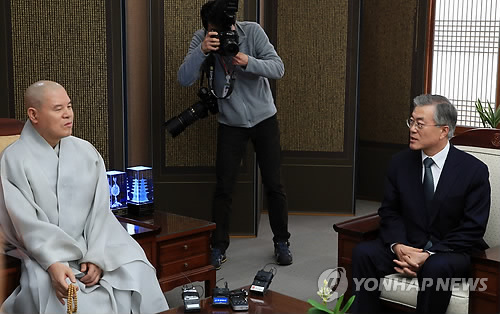 문 대표는 이날 취임 인사차 서울 견지동 한국불교역사문화기념관으로 자승 스님을 만난 자리에서 "거대 종단을 이끄는 스님들께서 우리 당에 좋은 말씀을 해주시면 당의 지침으로 삼겠다"고 인사했다.