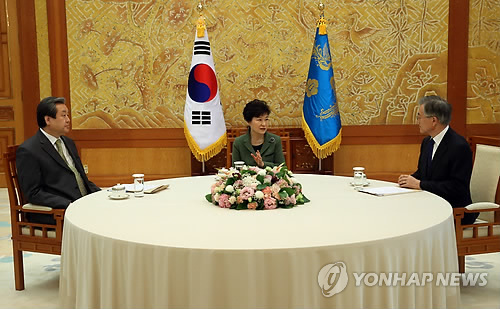 (서울=연합뉴스) 이귀원 홍정규 임형섭 기자 = 박근혜 대통령과 새누리당 김무성·새정치민주연합 문재인 대표는 17일 청와대에서 회담을 하고 경제활성화와 공무원 연금개혁, 남북관계 등에 대해 100분여간 논의했다.