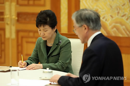 | △ 발언하는 문재인, 메모하는 박근혜 (서울=연합뉴스) 도광환 기자 = 17일 오후 청와대에서 열린 여야대표 회동에서 새정치민주연합 문재인 대표가 발언하자 박근혜 대통령이 메모하고 있다. |