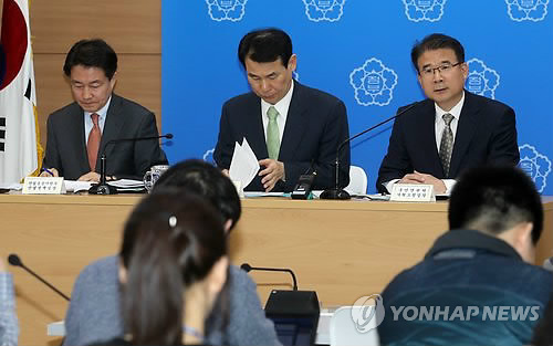 | △ '안전산업 활성화 방안' 관계부처 합동 브리핑 (세종=연합뉴스) 배재만 기자 = 정종제 국민안전처 기획조정실장(오른쪽)이 18일 오전 정부세종청사 제1공용브리핑룸에서 제7차 무역투자진흥회의에서 확정 발표될 '안전산업 활성화 방안'에 대해 사전 브리핑하고 있다. 왼쪽은 박청원 산업통상자원부 산업정책실장, 가운데는 정은보 기획재정부 차관보. |