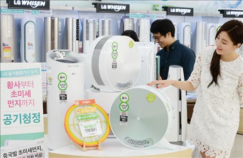 (서울=연합뉴스) 박대한 기자 = 미세먼지 주의보가 잇따라 발령되는 등 기승을 부리자 공기청정 가전 판매량이 늘어나고 있다.
