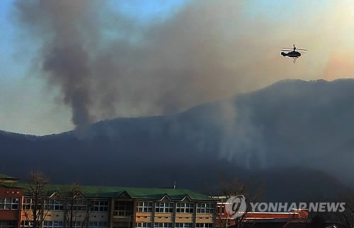 | △ '산불과의 전쟁'…화천 산불 이틀째 (춘천=연합뉴스) 강원 화천군 간동면 도송리에서 발생한 불이 이틀째 계속되고 있는 가운데 23일 오전 헬기가 마을 상공을 오가며 진화작업을 하고 있다. 이번 산불로 산림 3㏊가 소실된 것으로 잠정 파악됐다.2015.3.23 <<강원도소방본부>> dmz@yna.co.kr |