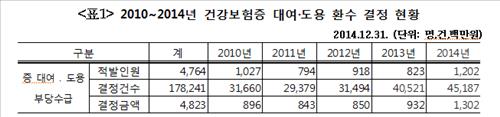 (서울=연합뉴스) 오수진 기자 = 국민건강보험공단은 지난해 건강보험증 대여· 도용 등으로 적발된 부정 사용 건수가 4만5천187건으로 지난 2010년 3만1천660건보다 약 1.5배 늘었다고 24일 밝혔다.