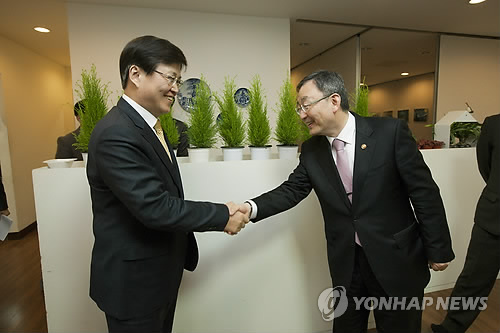 △ 미래창조과학부-방송통신위원회 정책협력 간담회 (서울=연합뉴스) 최양희 미래창조과학부 장관(왼쪽)과 최성준 방송통신위원회 위원장이 24일 오후 경기도 의왕시의 한 식당에서 정책협력 간담회를 하기 전 인사하고 있다. 2015.3.24 << 미래창조과학부 제공 >> photo@yna.co.kr
