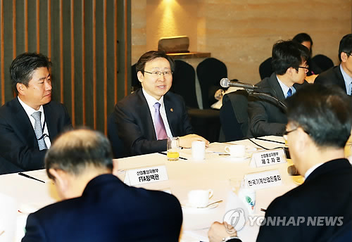 △ 문재도 차관, 업종단체 FTA 조찬 간담회 주재 (서울=연합뉴스) 문재도 산업통상자원부 2차관이 25일 서울 서초구 팔래스호텔에서 '업종단체(기업) FTA 조찬 간담회'를 주재하고 있다. 2015.3.25 << 산업통상자원부 제공 >> photo@yna.co.kr