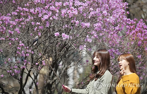| △ 캠퍼스 분홍빛 봄 (서울=연합뉴스) 이정훈 기자 = 숙명여자대학교 학생들이 25일 오전 만개한 진달래 앞에서 셀카를 찍으며 봄을 만끽하고 있다. |