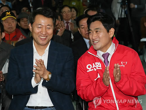 △ 대화하는 오세훈 전 서울시장과 오신환 후보 (서울=연합뉴스) 진성철 기자 = 4·29 재보궐선거 서울 관악을에 출마한 새누리당 오신환 국회의원 예비후보와 오세훈 전 서울시장이 26일 서울 관악구 오 후보 선거사무소에서 열린 선대위 발대식에서 대화하고 있다. 2015.3.26 zjin@yna.co.kr