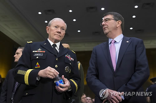 | △ 마틴 뎀프시 미국 합참의장(왼쪽)과 애슈턴 카터 미국 국방부 장관 (EPA=연합뉴스 자료사진) |