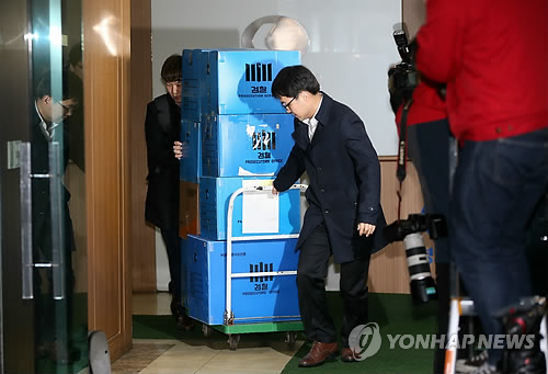 | △ 검찰이 '경남기업 융자금 용처·사내 비자금' 투트랙 추적중이다. 사진은 서울중앙지검 특수1부가 지난 18일 서울 동대문구 답십리동 경남기업 본사에 대한 압수수색을 진행, 이날 오후 검찰 관계자들이 압수품을 들고 나오고 있다. |