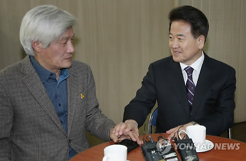 △ 대화하는 정동영 김세균 (서울=연합뉴스) 이상학 기자 = 국민모임 정동영 전 의원과 김세균 상임위원장이 26일 오후 여의도 '대륙으로 가는 길' 사무실에서 4·29 재보궐선거 등과 관련해 대화를 하고 있다. 2015.3.26 leesh@yna.co.kr