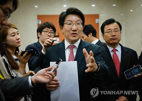 △ 해외자원개발 국조특위 권성동 간사 기자회견 (서울=연합뉴스) 진성철 기자 = 정부 및 공공기관 등의 해외자원개발 진상규명을 위한 국정조사특별위원회 소속 새누리당 권성동 여당 간사(가운데)와 이현재 의원이 17일 국회 정론관에서 이라크 쿠르드 원전 개발과 관련해 기자회견하고 있다.