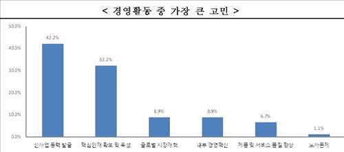 경영활동에서 겪는 가장 큰 고민거리를 묻는 질문에 응답자의 42.2%는 '신사업 동력발굴'이라 답했고 이어 32.2%가 '핵심인재 확보 및 육성'을 선택했다.