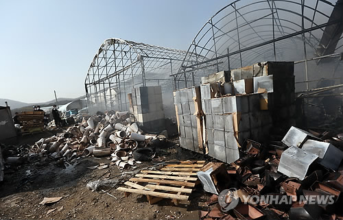 | △ 화훼단지 비닐하우스 화재 (서울=연합뉴스) 신준희 기자 = 30일 오후 불이 난 서울 서초구 내곡동 서울시농업기술센터 인근 화훼단지 비닐하우스에서 소방 관계자들이 원인 조사를 하고 있다. |