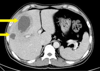 | △ 간에 고름이 찬 모습. 노란색 화살표 부위가 고름이다. |