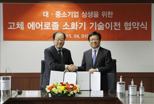 (서울=연합뉴스) 현윤경 기자 = ㈜한화[000880]는 1일 서울 중구 장교동 본사에서 강운파인엑스와 최첨단 자동소화 시스템인 '고체 에어로졸 소화기사업' 기술이전 협약을 맺었다.