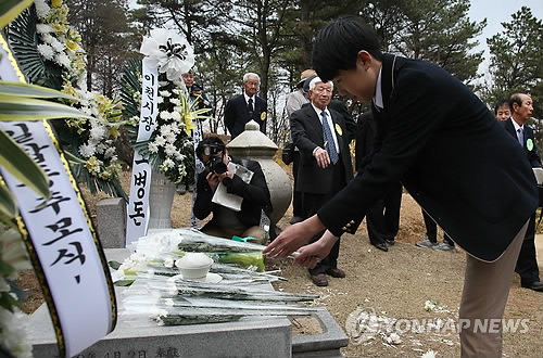 | △ 아사카와 다쿠미 기리는 학생 (서울=연합뉴스) 양지웅 기자 = 2일 오후 서울 중랑구 망우리 묘지 아사카와 다쿠미(淺川巧·1891∼1931) 묘역에서 이수현 의인 문화재단설립위원회 주최로 열린 84주기 한·일 합동 추모식에서 한 학생이 헌화하고 있다. |