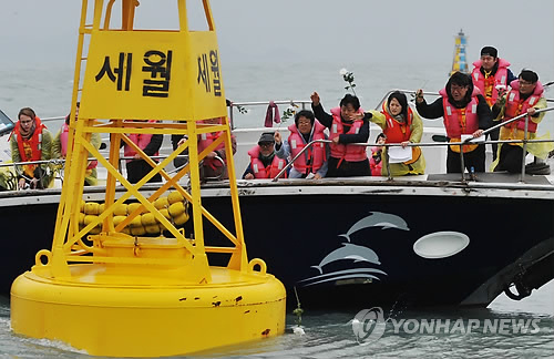 | △ 세월호 참사 1주년을 약 2주 앞둔 3일 오전 전남 진도군 조도면 세월호 침몰현장에서 세월호 유가족·실종자 가족, 한국기독교교회협의회(NCCK) 회원들이 기도를 올리고 헌화하고 있다. |