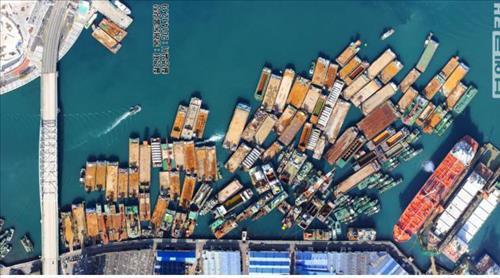 | △ 드론에서 촬영한 부산 영도구 봉래동 물량장 일대 모습. 정박 부선들이 항로를 침범해 있는 모습이 한눈에 들어온다. |