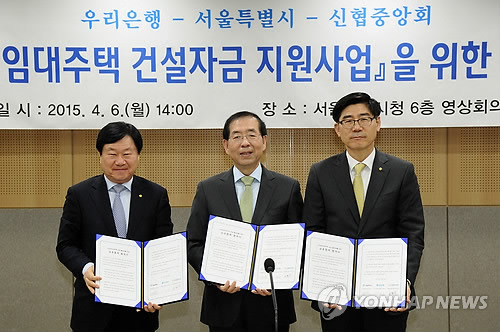 △ 서울시 준공공임대주택 건설자금 지원사업 (서울=연합뉴스) 박원순 서울시장(가운데)이 6일 오후 서울시청 신청사 6층 영상회의실에서 열린 '준공공임대주택 건설자금 지원사업'을 위한 협약식'에서 이광구 우리은행장(왼쪽), 문철상 신협중앙회장(오른쪽)과 협약서를 들고 기념촬영을 하고 있다. 협약을 통해 우리은행과 신협중앙회는 이달 중 관련 금융상품을 출시하고 서울시가 행정적·제도적으로 지원키로 했다. (서울시 제공)