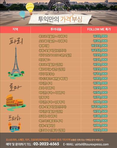 (서울=연합뉴스) 전준상 기자 = SM C&C 투어익스프레스는 프랑스 파리·이탈리아 로마·체코 프라하 등 유럽 시내 투어상품을 최저가에 판매한다고 6일 밝혔다.