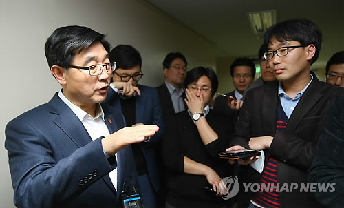 | △ 기자들의 질문에 답하는 이기권 장관 (서울=연합뉴스) 김도훈 기자 = 이기권 고용노동부장관이 3일 오후 서울 세종로 정부서울청사에서 노동시장구조개선을 위한 특위 관련 중간 브리핑이 끝난 뒤 기자들의 질문에 답하고 있다. |