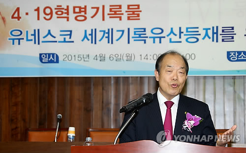 | △ 4·19혁명기록물 유네스코 세계기록유산등재를 위한 정책토론회 (서울=연합뉴스) 백승렬 기자 = 6일 국회 도서관에서 열린 4·19혁명기록물 유네스코 세계기록유산등재를 위한 정책토론회에서 김영진 전 의원이 기념사를 하고 있다. |