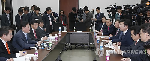 △ 연말정산 보완대책 당정협의 발언하는 최경환 장관 (서울=연합뉴스) 이상학 기자 = 최경환 부총리 겸 기획재정부 장관(왼쪽 두번째)이 7일 오전 국회에서 열린 연말정산 보완대책 당정협의에서 모두 발언을 하고 있다.