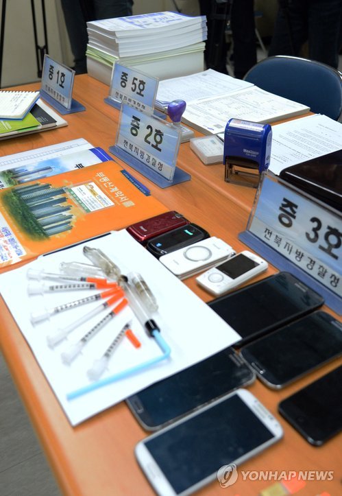 △ 조폭 낀 10억원대 전세자금 대출사기단 적발 전북지방경찰청 광역수사대가 적발한 10억대 서민전세자금 대출사기단이 사용한 위조서류와 마약 투약주사기.