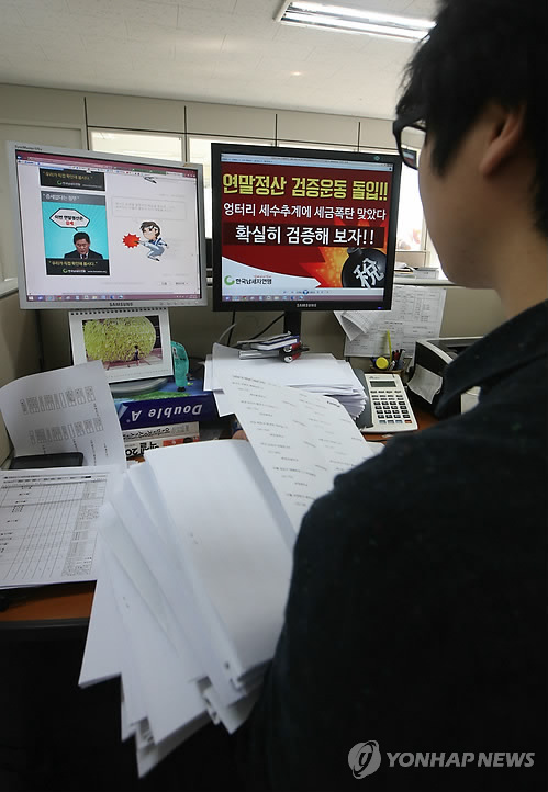 △ 납세자연맹 "연말정산 보완책 합리성, 공평성 결여' (서울=연합뉴스) 김주성 기자 = 정부가 연말정산 보완대책을 발표한 7일 서울 종로구 신문로 한국납세자연맹에서 직원들이 이번 보완책과 관련한 납세자 권리 찾기 활동 계획을 논의하고 있다. 한국납세자연맹은 이번 보완대책과 관련, "근로소득 과세에 대한 기본 철학이나 원칙도 없이 합리성과 공평성이 결여된 세법개정과 세수 추계로 소득세법을 누더기로 만들어 놨다"고 비판했다.