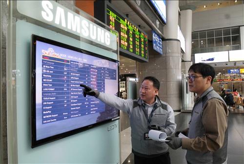 | △ 지난 6일, 삼성전자서비스 엔지니어들이 서울 용산역을 방문해 역사내에 설치된 삼성전자 TV를 대상으로 사전 점검 서비스를 진행하고 있다. |