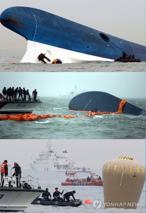 | △ <세월호 참사 1년> 야속하게 침몰하는 세월호 (진도=연합뉴스) 세월호 참사가 발생한 지 16일로 1년이 된다. 상당수 국민은 충격과 슬픔에서 벗어나 일상으로 돌아갔지만 유족과 실종자 가족의 상처는 여전하다. 연합뉴스는 세월호 참사 1년을 뒤돌아 보고 그동안의 진상규명과 과정과 한국 사회의 안전 변화상, 개선방향을 점검한다. 사진은 2014년 4월 16일 전남 관매도 앞 해상에서 일어난 전복 사고 직후 선수 부분이 나온 세월호의 모습과 4월 17일 오전 모습(가운데). 4월 18일 오후 물 아래로 잠긴 가운데 리프트백을 설치한 모습. 2015.4.6 << 연합뉴스DB >> photo@yna.co.kr |